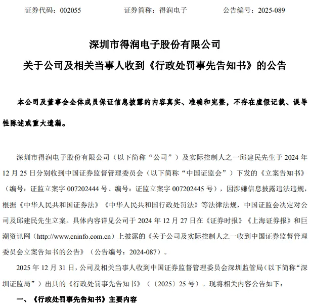 深圳市得润电子股份有限公司(以下简称得润电子或公司)涉嫌信息披露违法违规一案,已由我局调查完毕,我局依法拟对你们作出行政处罚。现将我局拟作出行政处罚所根据的事实、理由、依据以及你们享有的权利予以告知。