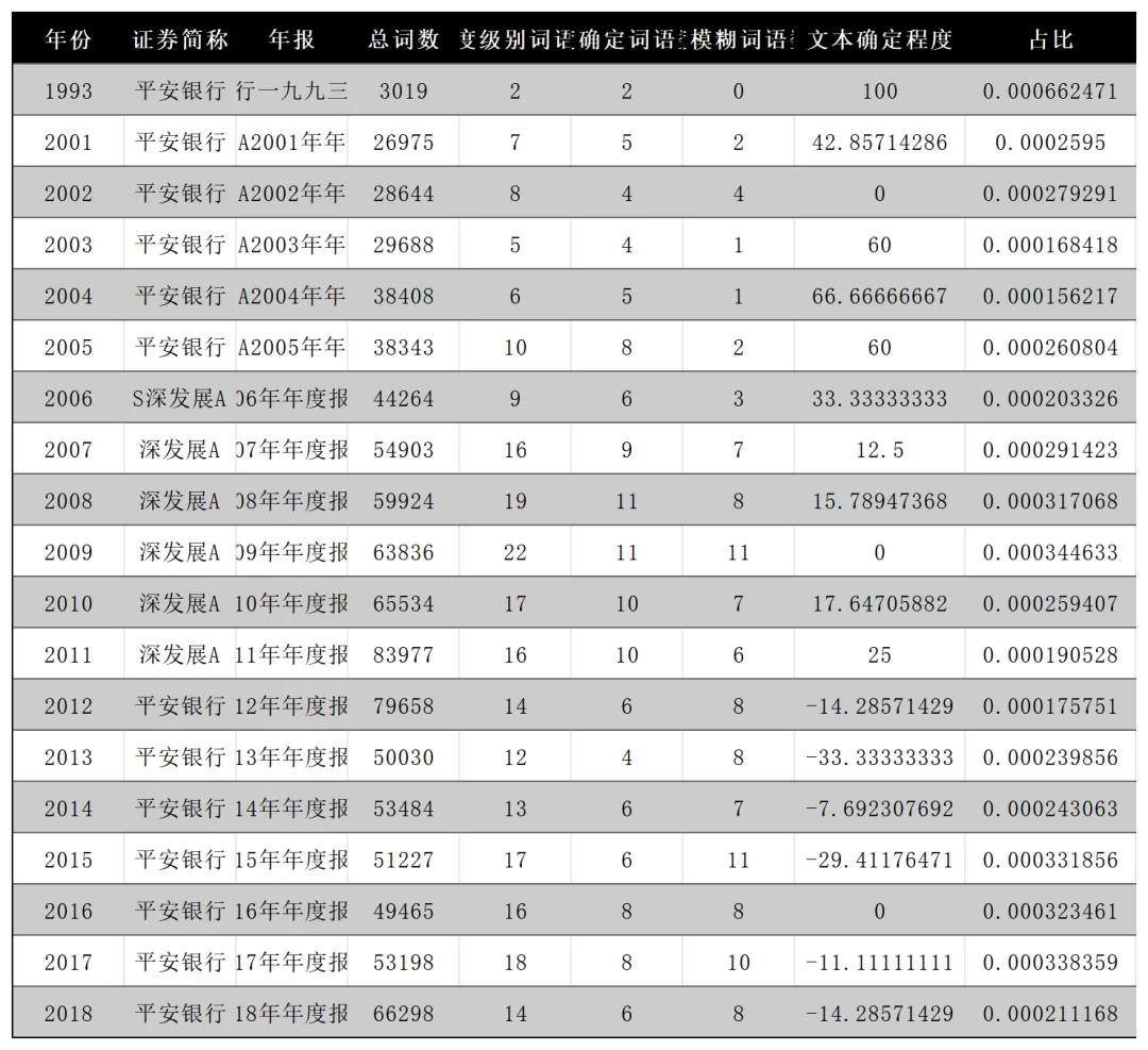 参考阮睿等(2021),统计每一类词语在年报文本中出现的次数,把词语分为程度确定词语数量和程度模糊词语数量,并且以 (程度确定词语数量-程度模糊词语数量) /总程度级别词语数量×100来衡量文本确定程度。