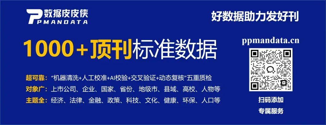 CNPaperData(简称CNPD)是立足大规模数据采集、清洗、挖掘的国家高新技术企业,借鉴Compustat、WRDS等国际知名数据库及FT50期刊专业标准,打造中国特色经济管理社会科学研究型数据库。涵盖上市公司、企业、省份、地级市、县域、高校、人物等研究对象,涵盖经济、法律、金融、政策、科技、文化、健康、环保、人口等各类热门数据。顶刊标准数据,好数据助力发好刊!获取数据地址https://www.ppmandata.cn/trade/list
