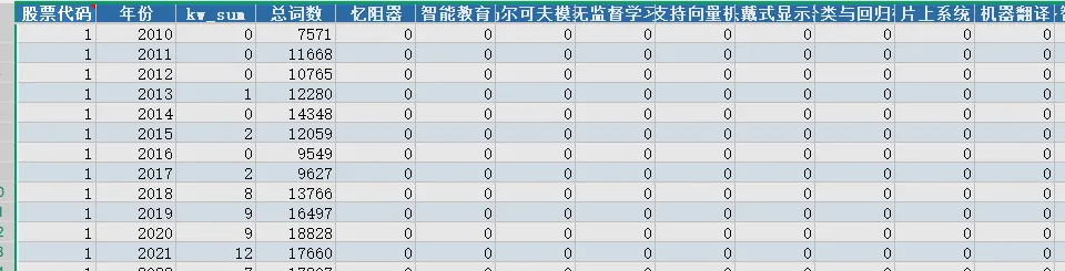 股票代码 | 年份 | kw_sum | 总词数 | 忆阻器 | 智能教育 | 马尔可夫模型 |