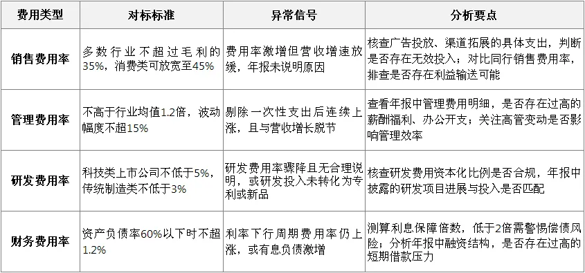 四大费用率是检验上市公司盈利转化效率的关键,也是排查财务风险的重要抓手。上市公司的费用管控能力,直接决定其能否将毛利转化为真实的净利润,以下表格为分析提供对标方向: