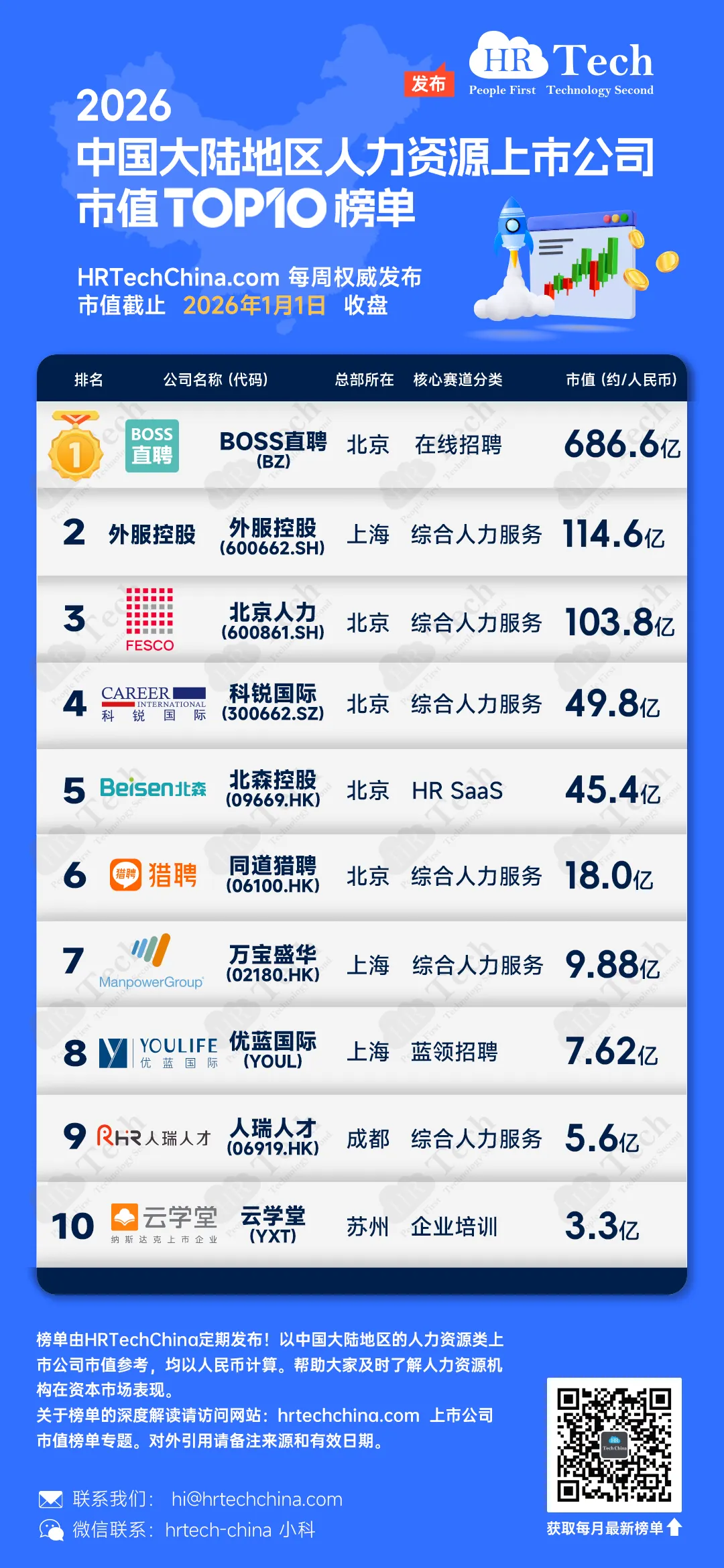 本榜单以中国大陆地区人力资源相关上市公司为统计范围,统一以人民币市值计算,市值截至 2026 年 1 月 1 日收盘。