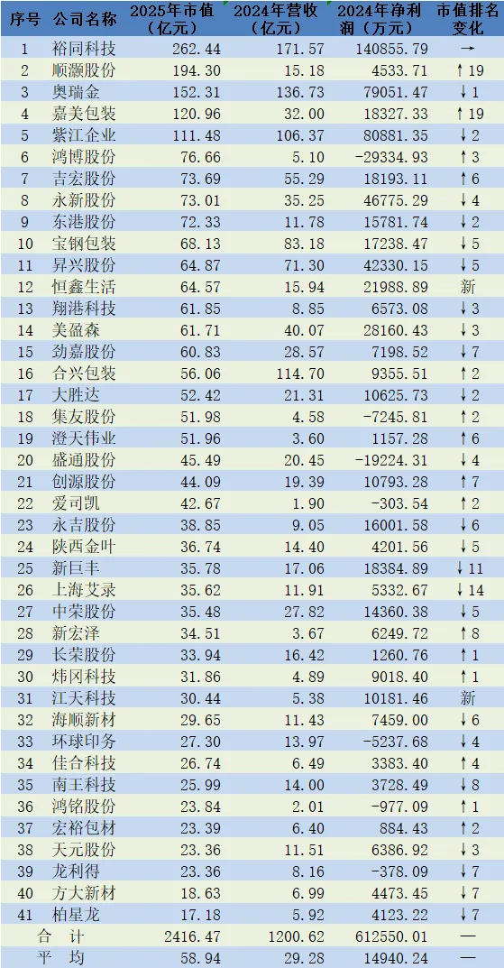 位居第三的是印铁制罐龙头奥瑞金,市值为152.31亿元;位居第四的是同样异军突起的嘉美包装,市值为120.96亿元,排名相对2024年也提升了19位。
