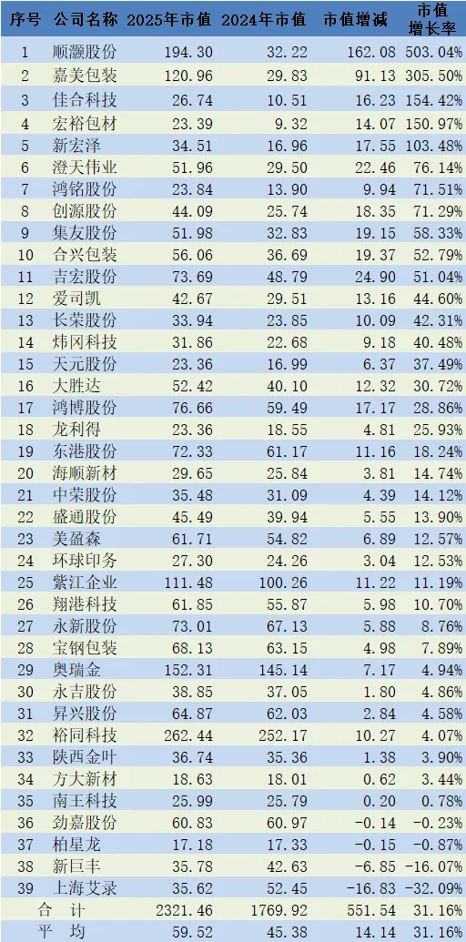 顺灏股份和嘉美包装两家企业,合计市值增量达到253.21亿元,在39家企业市值增量551.54亿元中的占比高达45.91%,是毫无争议的领涨力量。