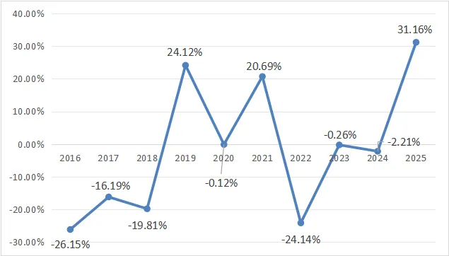 在实现上涨的三个年度中,2019年和2022年同比增幅分别为24.12%、20.69%,2025年31.16%的增幅显然更加耀眼。
