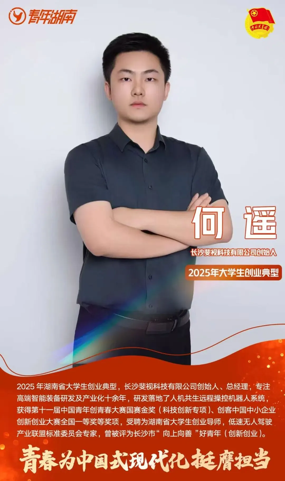 专注高端智能装备研发及产业化十余年,成功研发落地人机共生远程操控机器人系统,如今的何遥,已是长沙斐视科技有限公司创始人、总经理,仍在用技术创新践行着年少时“机器代人”的初心。凭借过硬的技术实力与突出的创新成果,团队斩获第十一届中国青年“创青春”大赛国赛金奖(科技创新专项)、“创客中国”中小企业创新创业大赛全国一等奖等多项重磅荣誉。他本人受聘为低速无人驾驶产业联盟标准委员会专家,入选2025年湖南省大学生创业典型。
