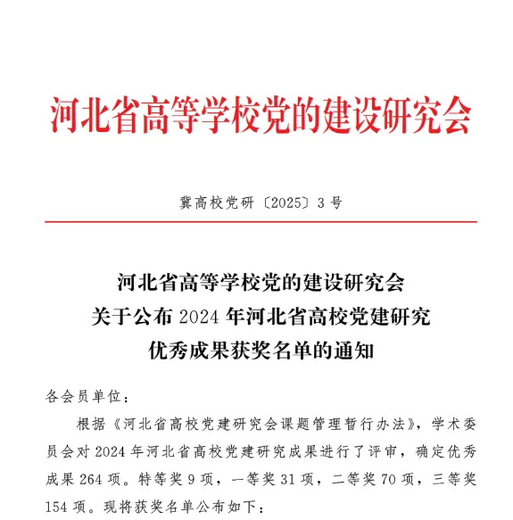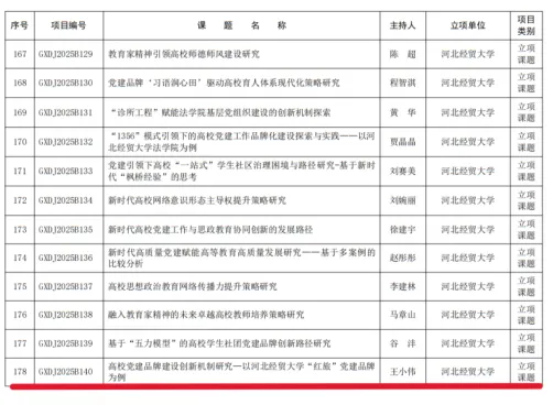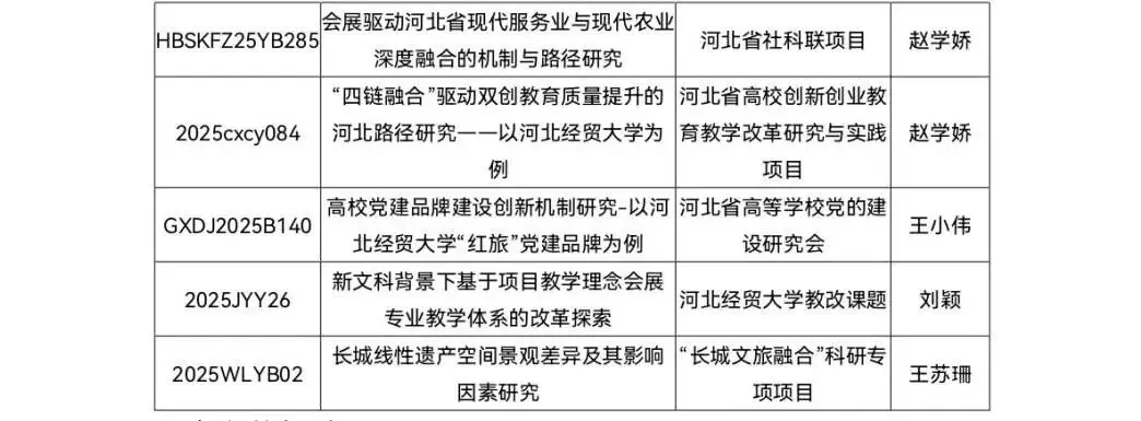 获批河北省创新创业教改课题1项,河北省社课联项目1项,河北省高等学校党的建设研究会课题1项,校级课题2项。