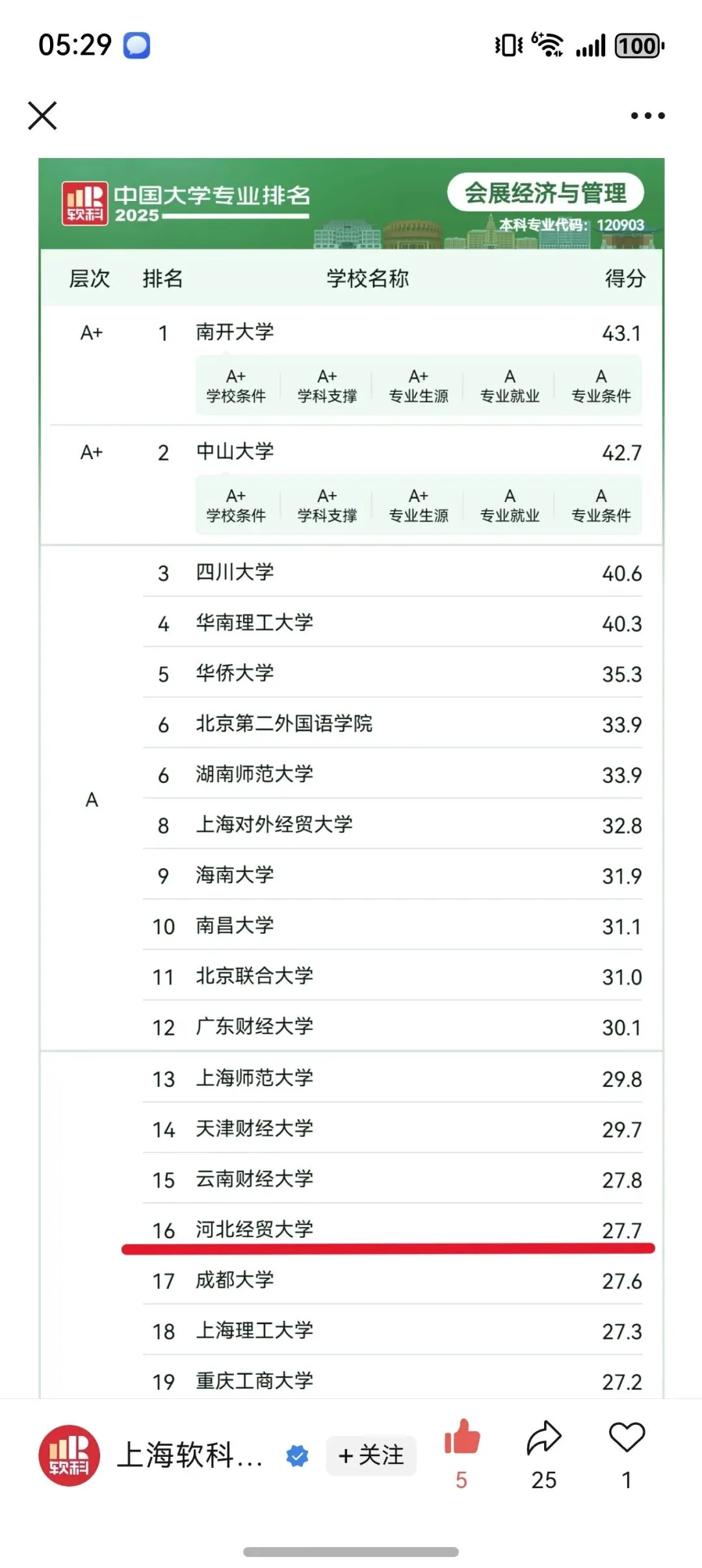 -2025年软科专业排名,会展专业省内第一,在全国的位次上升到16名。