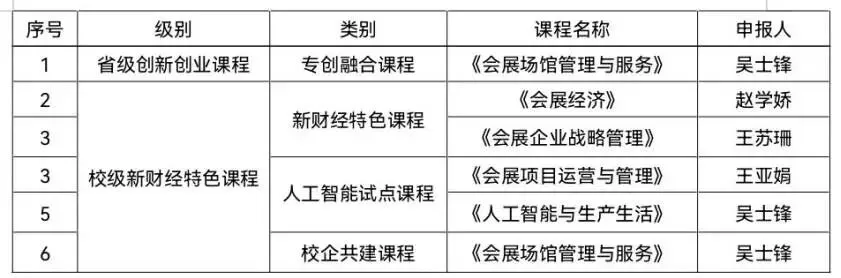 -2025年,获批省级创新创业课程1门,校级新财经特色课程2门,校级人工智能试点改革课程2门,校级校企合作课程1门。