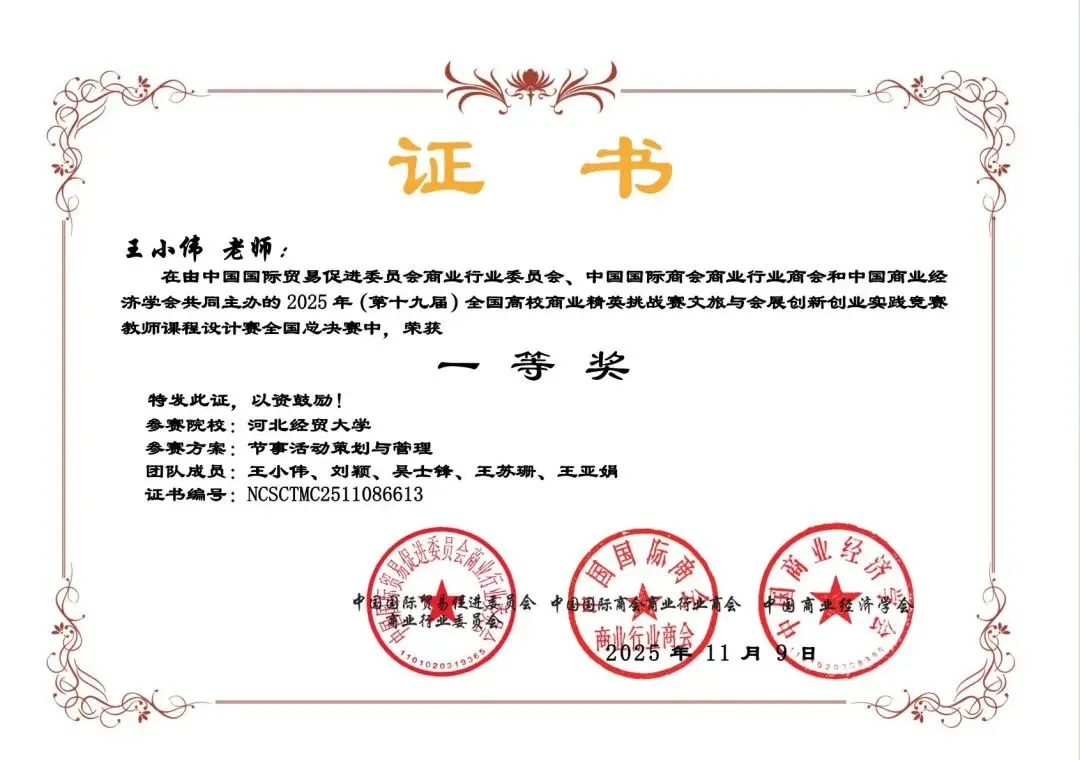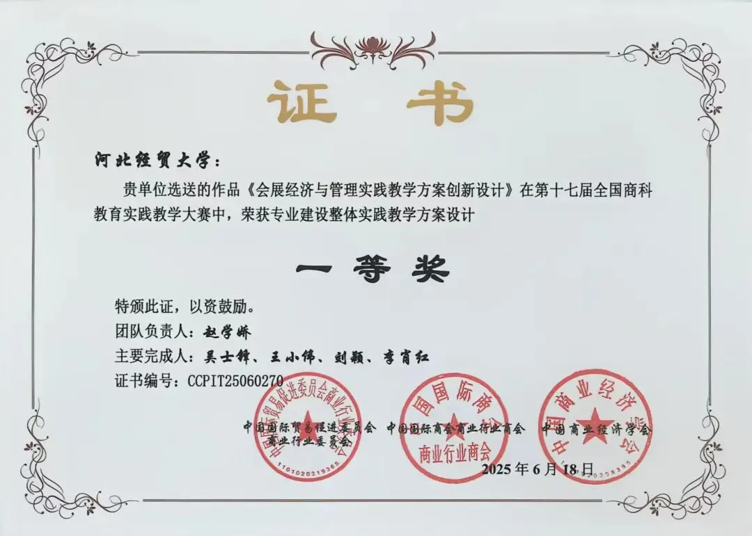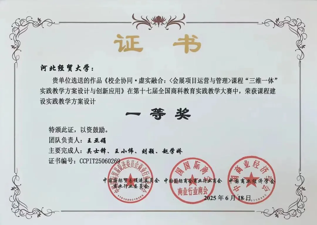 -2025年会展系教师参加由中国国际贸易促进委员会商业行业委员会、中国国际商会商业行业商会和中国商业经济学会主办的第十七届全国商科教育实践教学大赛和科研课题大赛,获得3项国赛一等奖。