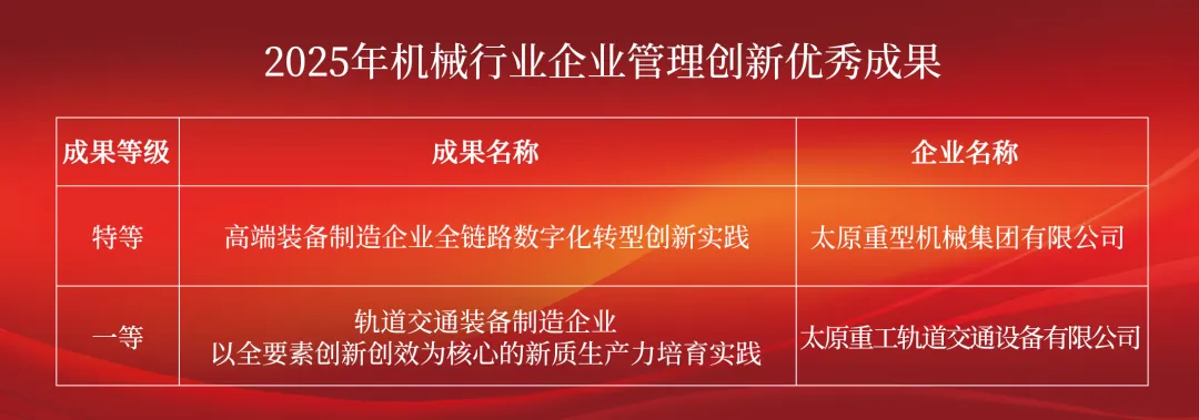 改革之路,创新筑基!近日,中国机械行业企业管理协会正式发布2025年机械行业企业管理创新优秀成果名单,太重两项成果荣耀上榜,分别获得特等奖和一等奖。