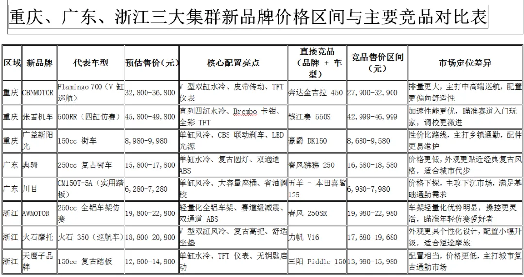 - 价格策略:新品牌普遍采用 **“同配置低 10%-15% 售价”** 的打法,尤其是通勤级车型(150cc 及以下),价格下探明显,主攻下沉市场;中大排量车型则以 “高配平价” 吸引玩乐用户。