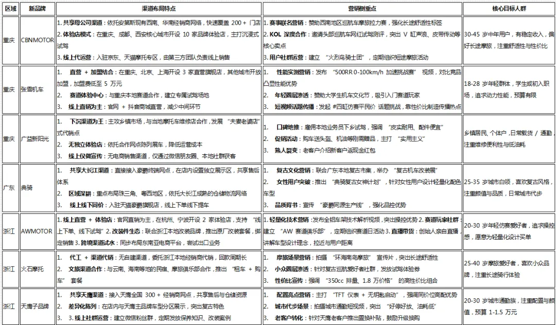 品质背书 + 细分人群突破,复古车型主打文化营销,实用踏板车依赖批发市场走量,渠道共享属性强。- 浙江集群:民营资本灵活,