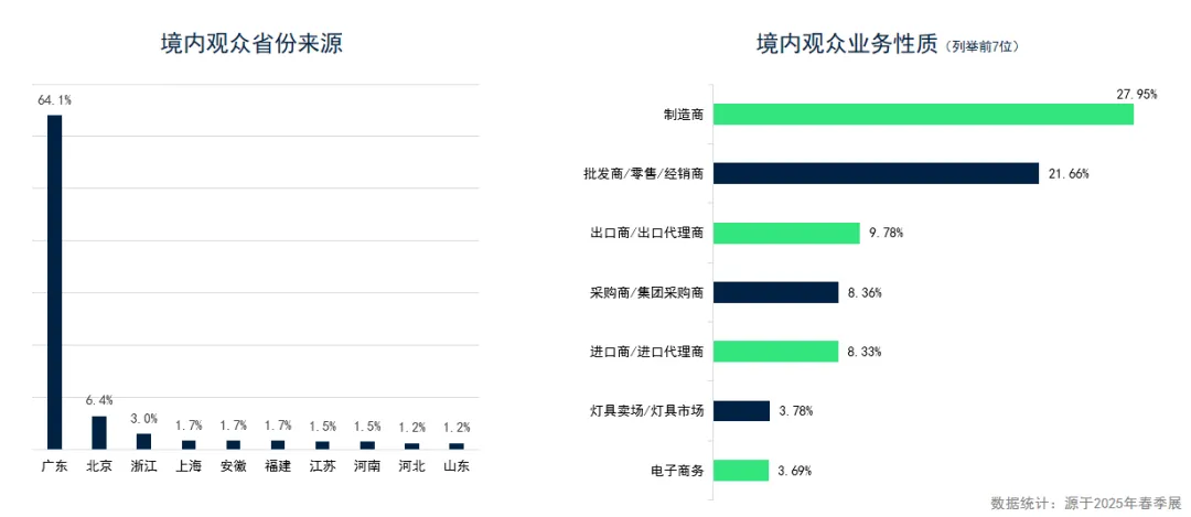 根据上届展会统计,春季展共吸引专业观众107,307人次,其中来自全球120个国家和地区的境外采购商达5,034人次,观众数量与来源地广度均创新高。到会观众中,制造商与经销商占比约50%,企业决策及管理人员占比超过78%,充分体现了博览会在全球照明产业供应链中的关键节点价值与高度专业性。