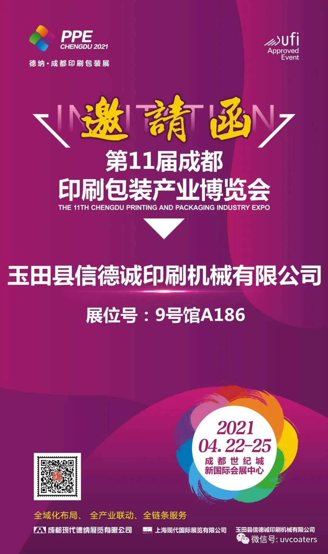 玉田县信德诚印刷机械有限公司将于2021年4月22日-25日参加第11届成都印刷包装产业博览会暨2021成都印刷精品展, 展位号 9号馆A186。