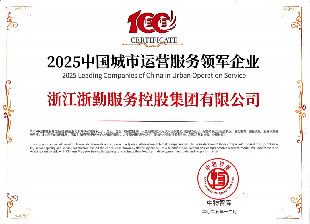 浙勤服务控股集团在中物智库主办的2025中国物业高品质服务力评选中,凭借在城市运营服务领域的卓越实践与综合实力,荣膺"2025中国城市运营服务领军企业"称号。这一荣誉,标志着浙勤服务在标准化建设、智慧化转型与服务品质保障等方面得到行业充分认可。