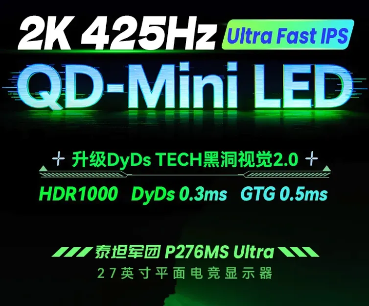 作为泰坦军团技术实力的集大成之作,P276MS Ultra尽显电竞显示领域的性能优势:采用2K分辨率与425Hz超高刷新率的黄金组合,搭配Ultra Fast IPS面板,GTG灰阶响应时间压缩至0.5ms,为电竞玩家提供清晰精准的动态画面效果;其搭载的QD-MiniLED背光技术,可实现HDR1000级别的高亮画面,在游戏和观影时带来更为惊艳、沉浸的视觉体验。
