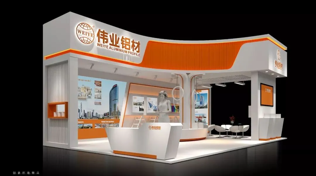 伟业本次展位整体造型采用发放式的设计展示伟业工业铝型材产品,主体形象通过橙色和白色结构体,运用流线型的构成,贯彻整个门头结构,伟业LOGO和造型比例营造出时尚、科技和工业感,彰显伟业铝材科技工业的概念。