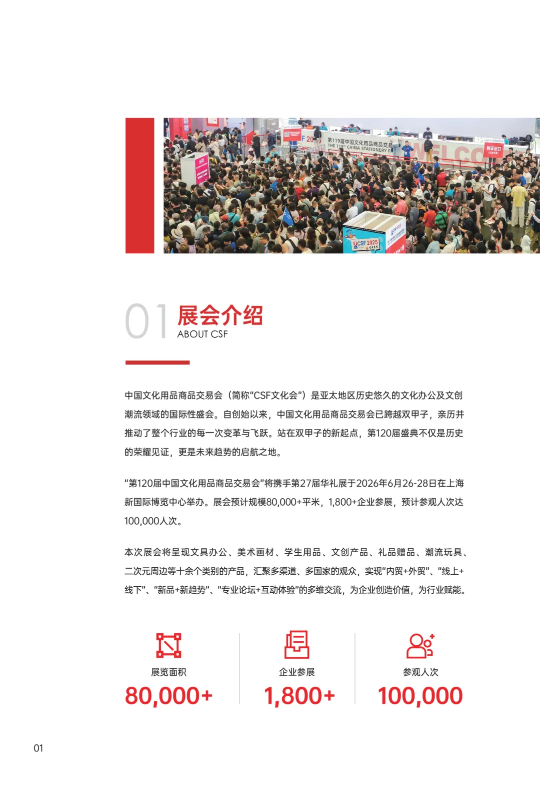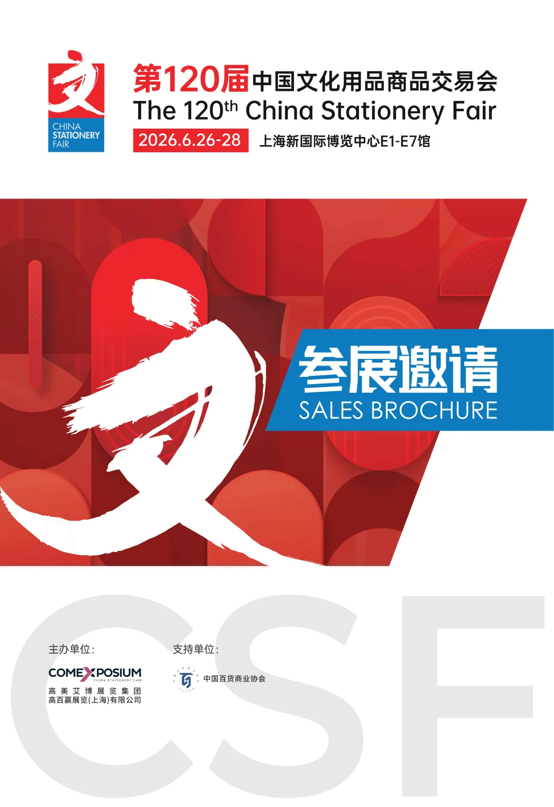 2026 年 6 月 26-28 日,跨越双甲子的行业盛会 —— 第 120 届中国文化用品商品交易会(CSF 文化会),将携手第 27 届华礼展登陆上海新国际博览中心(E1-E7 馆)!8 万㎡超大展区、1800 + 参展企业、10 万 + 专业观众,打造亚太地区文化办公及文创潮流核心平台。