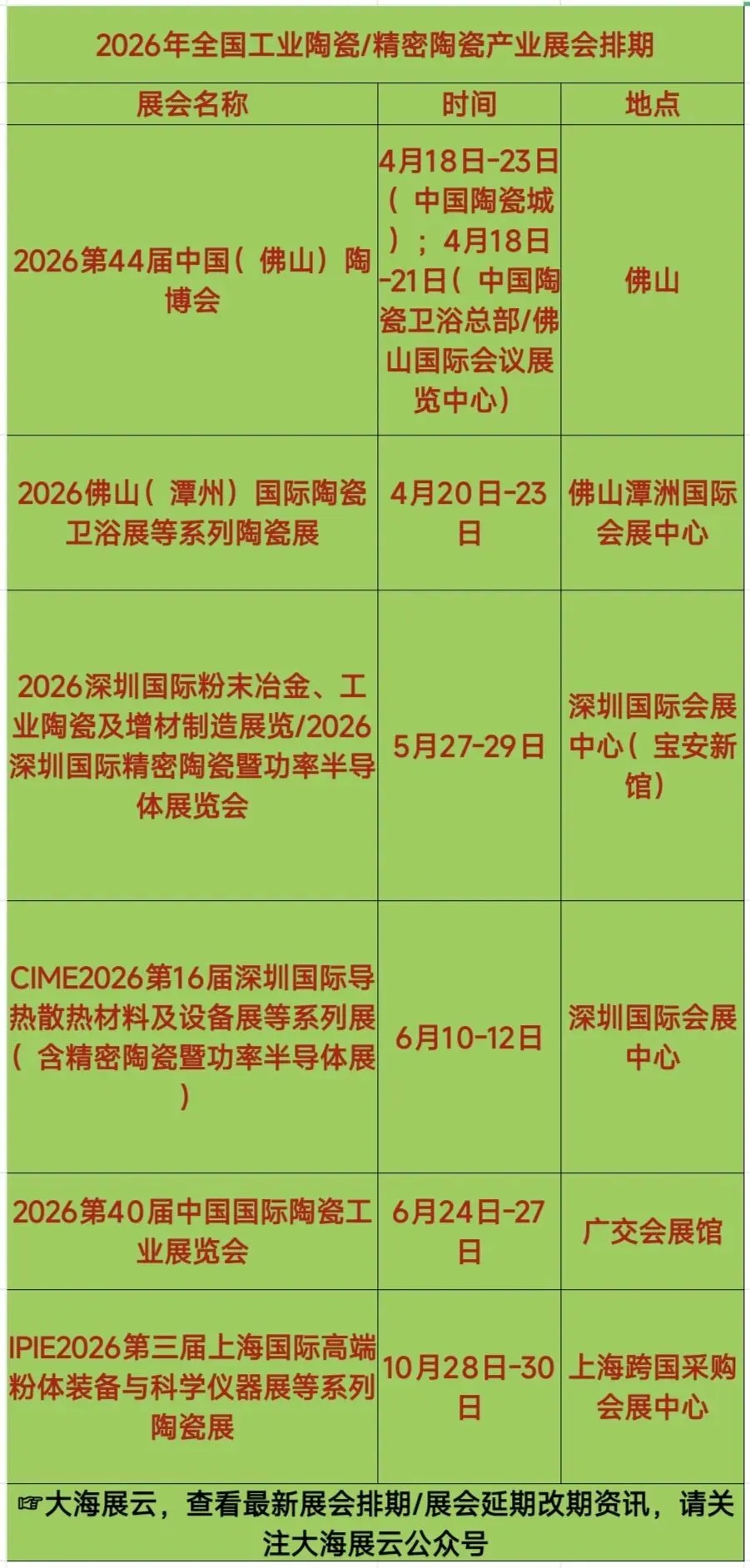 2026年全国工业陶瓷/精密陶瓷产业展会排期