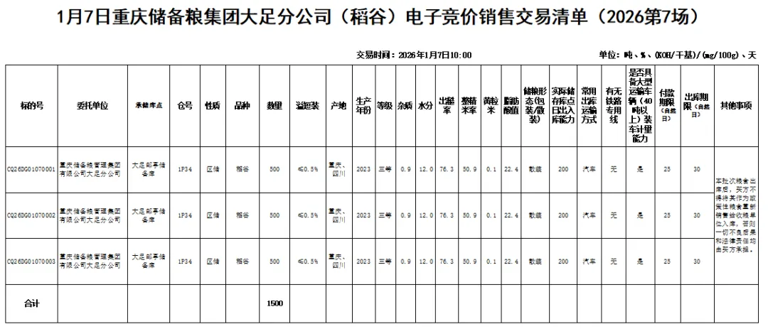 受重庆储备粮管理集团有限公司大足分公司委托,重庆市粮油批发市场有限责任公司(即国家粮食重庆交易中心,以下简称“批发市场公司”),定于2026年1月7日10:00举办重庆储备粮集团大足分公司(稻谷)电子竞价销售交易会,现将有关事项公告如下: