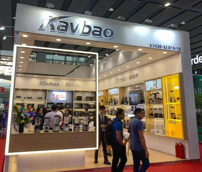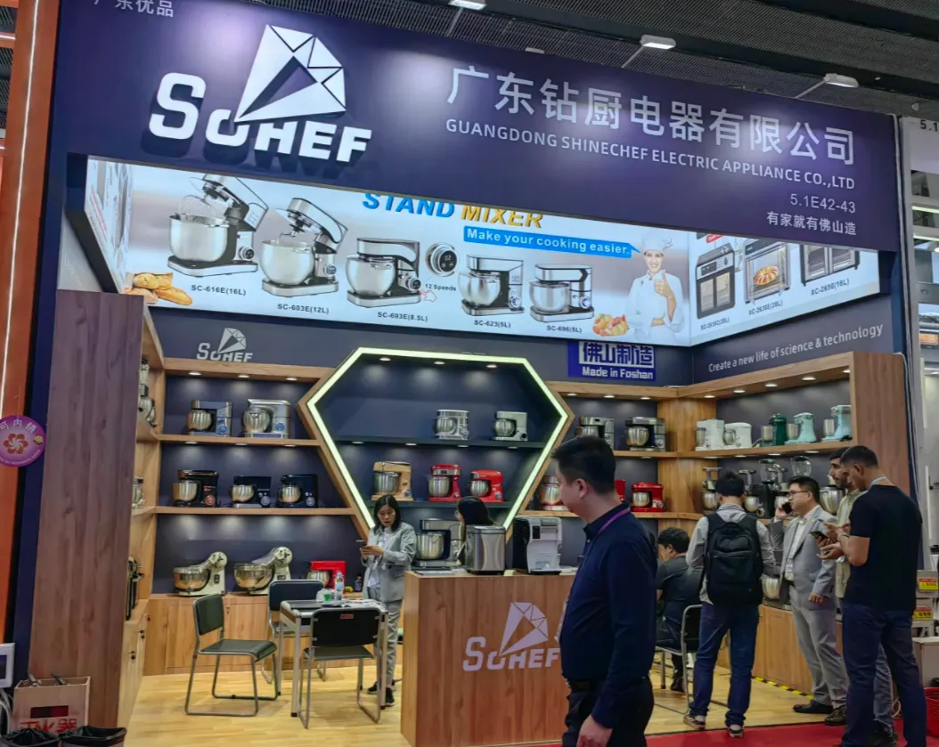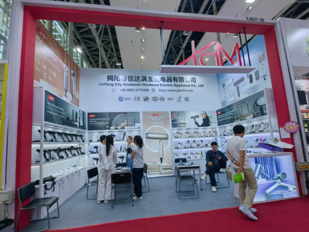 落地呈现:信达满、钻厨电器展台融入产品场景化海报(如吹风机使用场景、厨师机料理场景),搭配分类式陈列货架,强化品类属性与产品实用性;上海轩睿则聚焦“OEM/ODM”核心定位,以简约灰白为基底,集中展示电水壶等核心单品,搭配精简的定位标语,精准触达B端采购商需求,避免视觉干扰。