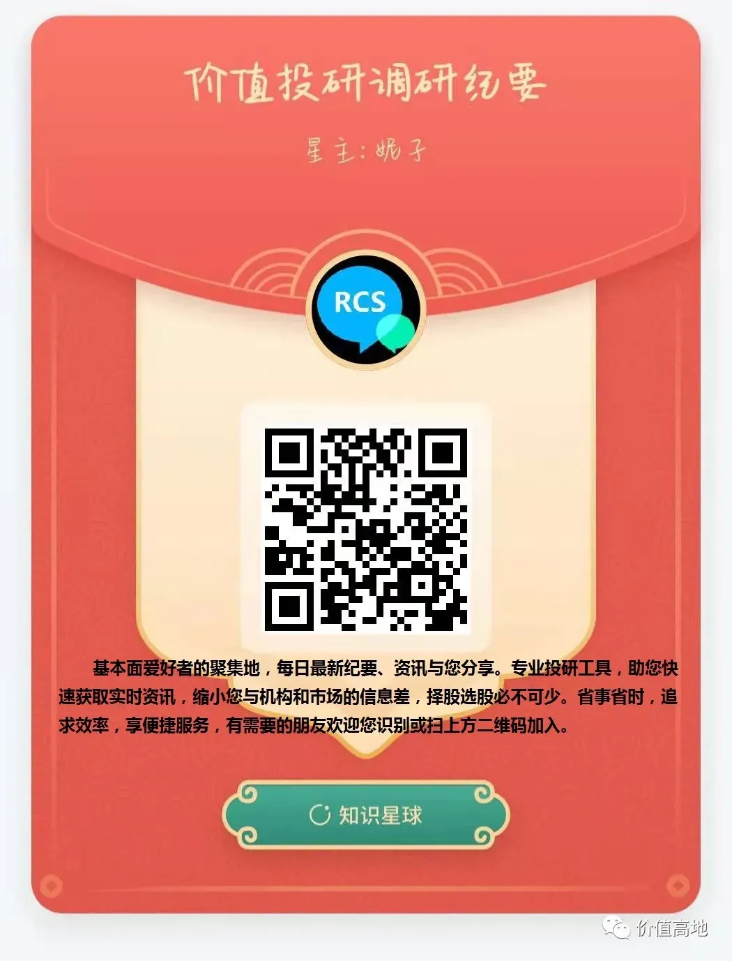 如果想成为一名合格的投资者,一款辅助工具特别重要,本星球将会是您一个优质的选择,现开放运营以来,已受到部分朋友的关注,需要了解更多投资资讯,调研纪要,会议纪要、行业分析报告关注上方星球二维码,每日最新推送,专业投研工具,让您选股无忧。基本面爱好者的集合地,如果您是基本面的爱好者以及想掌握各行业实时资讯那么这里或许比较合适您 点“赞”“在看”,转发,优质资讯与您一起分享