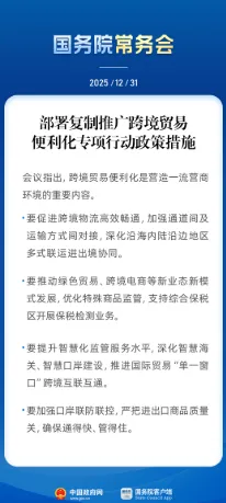 新华社北京12月31日电(记者 谢希瑶)12月31日召开的国务院常务会议指出,跨境贸易便利化是营造一流营商环境的重要内容。会议部署复制推广跨境贸易便利化专项行动政策措施。