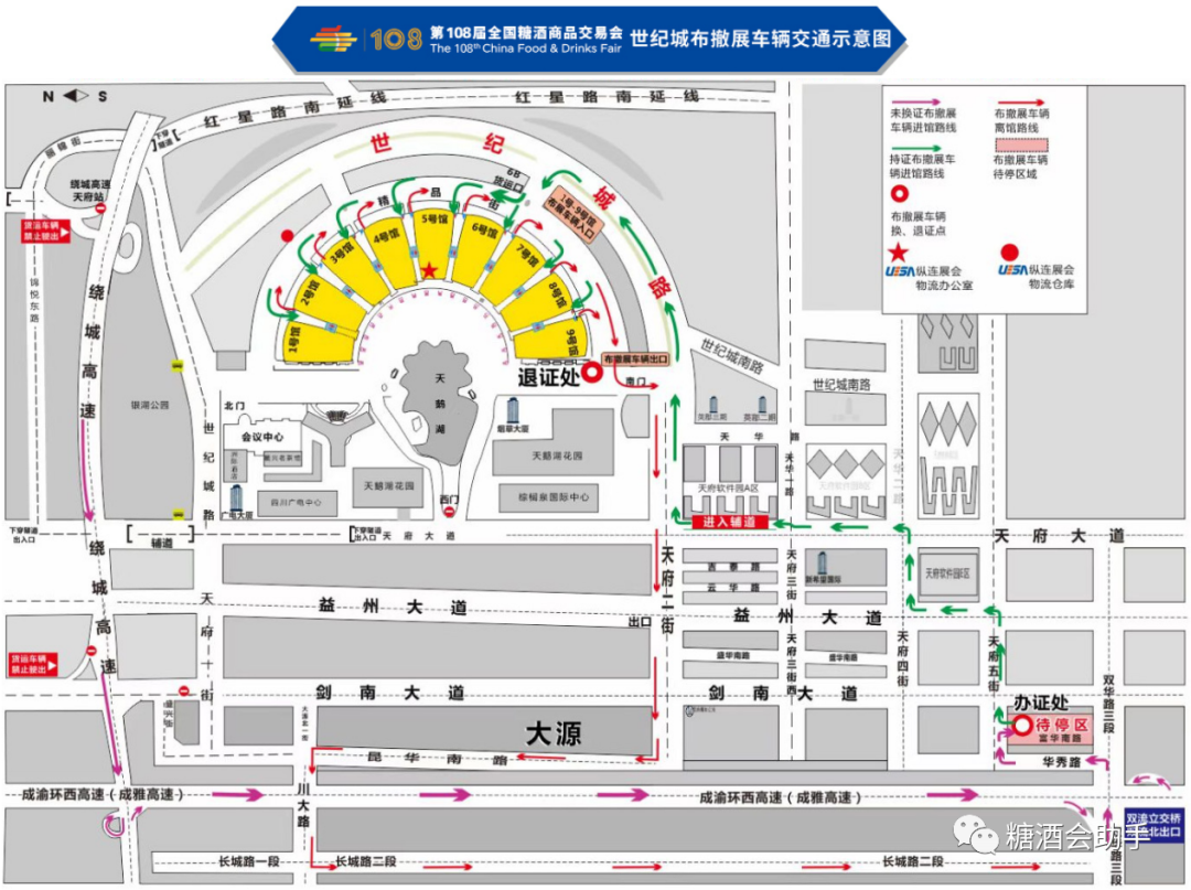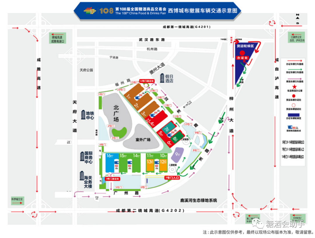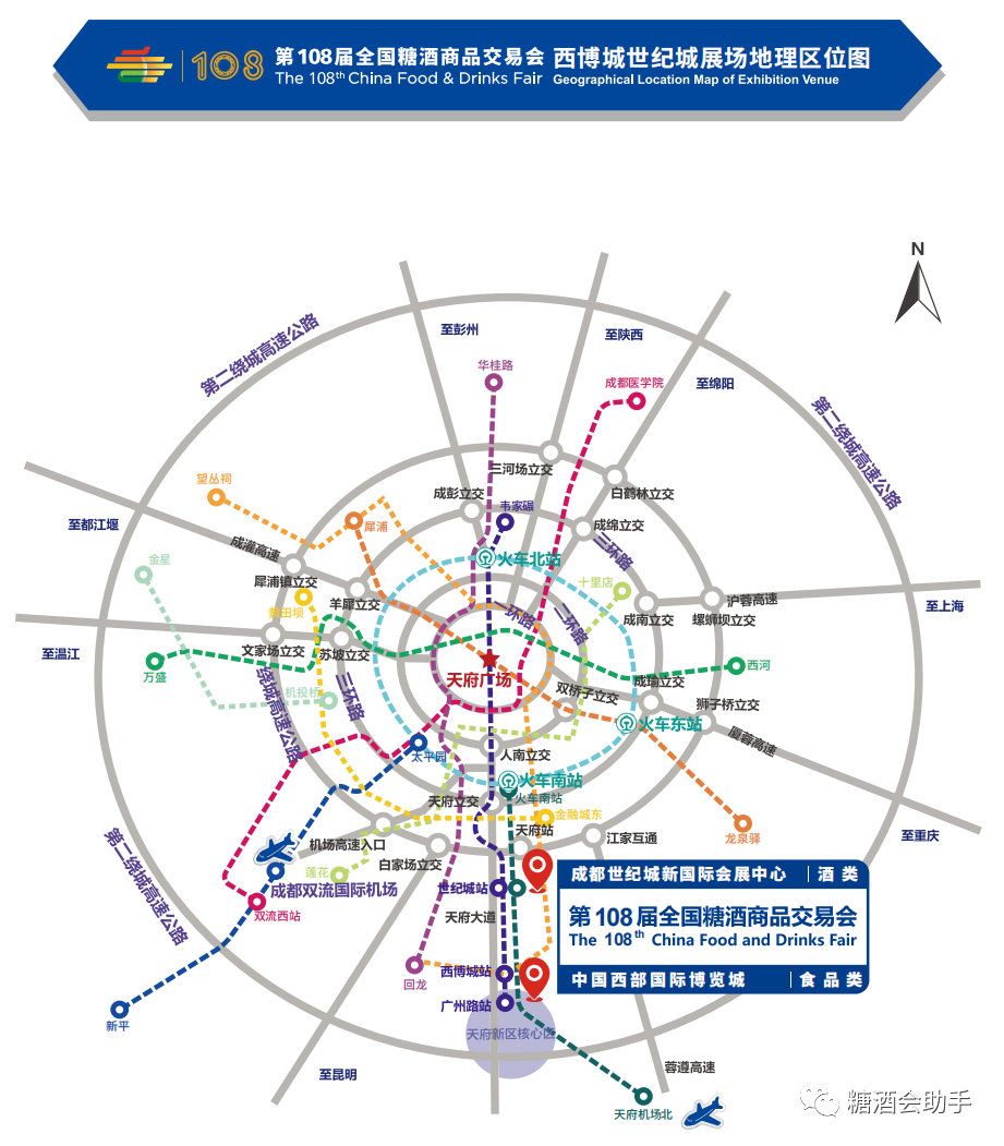 中国西部国际博览城:地铁1号线2个站点以及地铁6号线、18号线西博城站均与西博城无缝衔接;4条城市主干道、多条城市道路直达西博城,场馆内设置地面停车位800个、地下停车位3000个,场馆周边设置停车位6000个,建有10万m²的专用货运轮候区。西博城距离成都双流国际机场15分钟车程,经成都双流国际机场200条国内航线、110条国际地区航线通达世界各地。西博城距离成都南站20Km、成都东站、成都北站30Km,经西成高铁、成渝高铁、沪汉蓉高铁等铁路通达全国各主要城市。成都世纪城新国际会展中心:乘坐地铁一号线在世纪城站下车,由C出口到达;从火车北站乘16路到火车南站转乘102、545、806路在新会展中心北侧下车即到;乘300路到火车南站转乘102、545、806路在新会展中心北侧下车即到; 市内其他地方:可乘84、504、118、115路直接抵达新会展中心。.展区功能图.