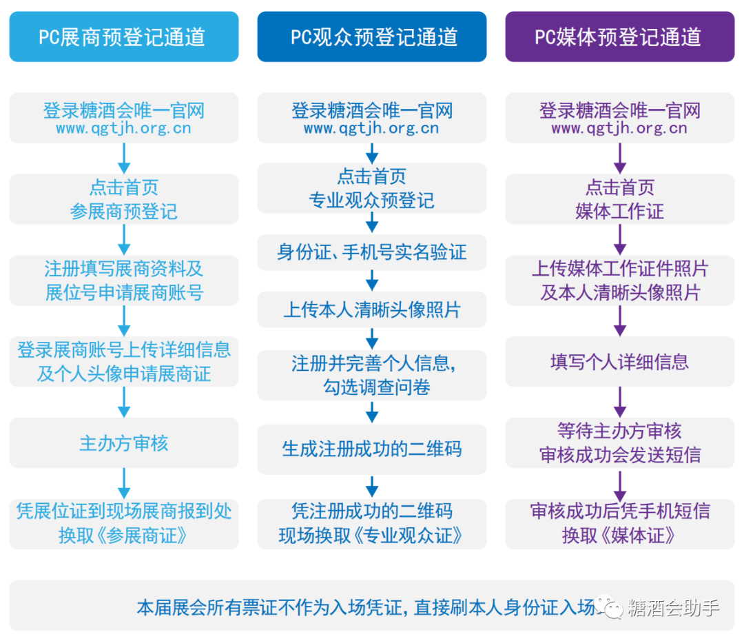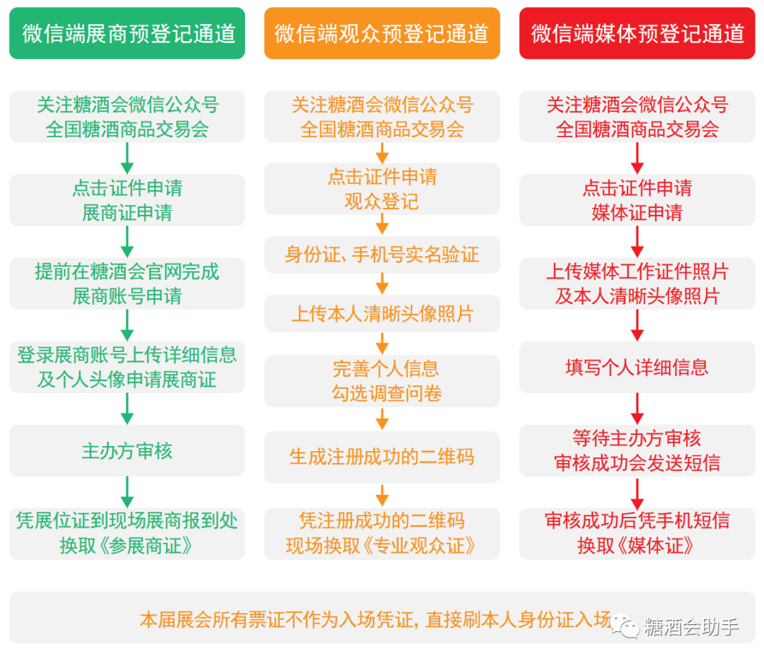 媒体预登记通道:媒体人员信息登记,等待审核通过后,现场换取媒体证(持身份证入场)。