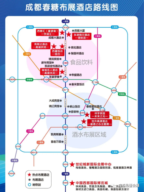 简介:老牌调味品专区酒店,总高11层,1-6大厅,7-11层房间,全部布展,整体呈一字型布局,体量不大,胜在专业,是调味人必去之地。简介:成都经济型酒店,地处传统的糖酒会酒店展商圈,人气较旺。酒店1-6楼为展厅,13-16楼为房间,中间无断层,方便经销商一站式逛展,节省时间。①地铁:展会期间人群流量巨大,停车位“一位难求”,几乎所有布展酒店都禁止车辆通行,建议观展客商选择地铁出行,方便快捷。