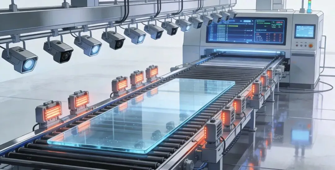 全线部署缺陷检测仪+AI视觉系统,实时识别玻璃厚度、边部位置及表面瑕疵,数据直连优化切割系统,废板率降低30%。