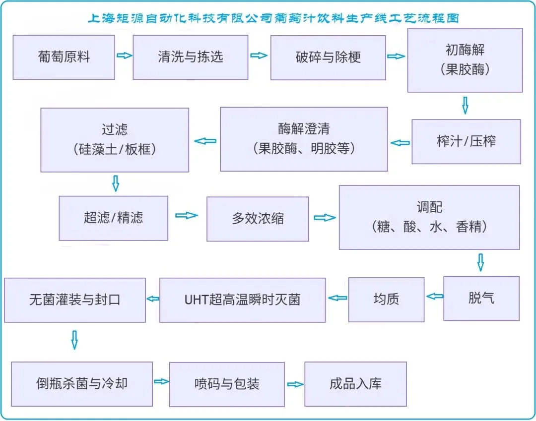 矩源葡萄汁饮料生产线可生产多种产品类型,包括原汁、浓缩汁、果汁饮料等,包装形式涵盖PET瓶、玻璃瓶、易拉罐、屋顶包、无菌大袋等。产品具有丰富的营养价值,含有多种维生素、矿物质和抗氧化物质,深受消费者喜爱。