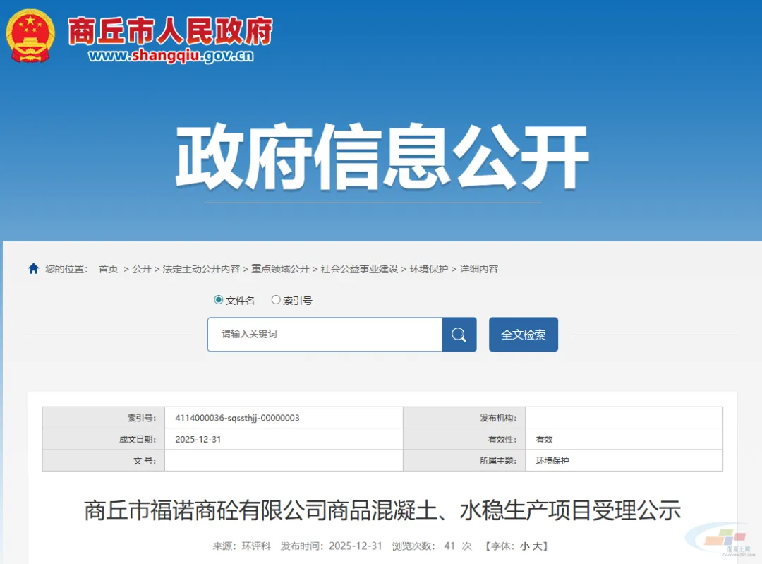 12月31日,河南省商丘市人民政府网站发布关于商丘市福诺商砼有限公司商品混凝土、水稳生产项目环评受理的公示,公示期2025年12月31日-2026年1月7日(5个工作日)。
