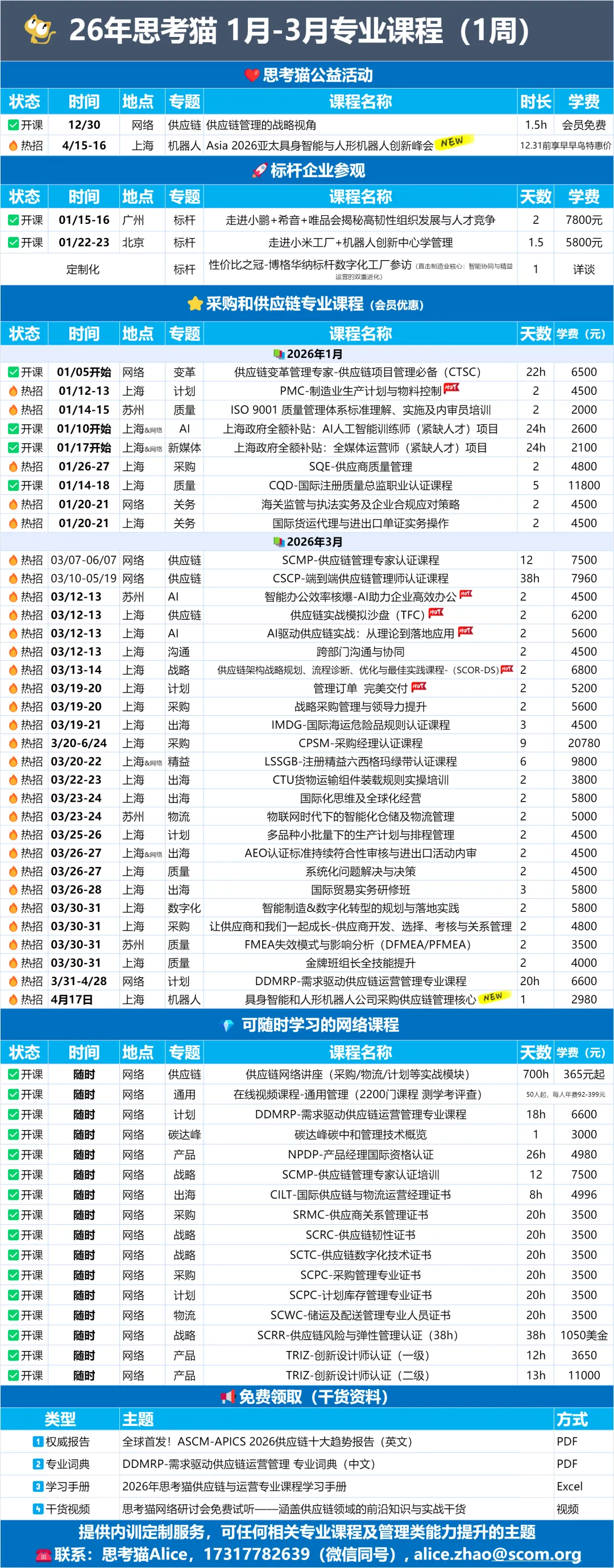 标准价:¥5600/人 *含授课费、证书费、资料费、午餐费等维护积分:可申请12分 *适用CSCP/CPIM/CLTD/SCMP/CPSM认证赠送:免费参加每周实时网络分享课程一年(40+实时供应链干货分享讲座免费听)联系方式:17349738905(微信同号)