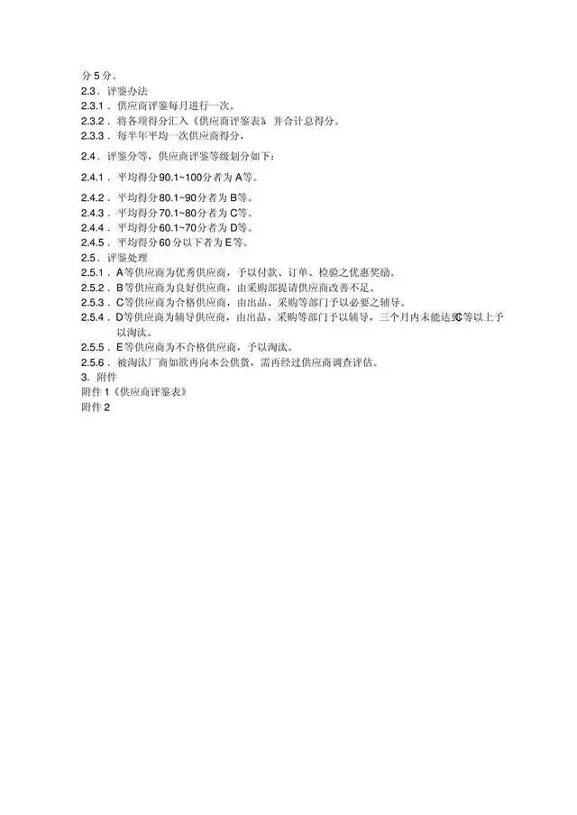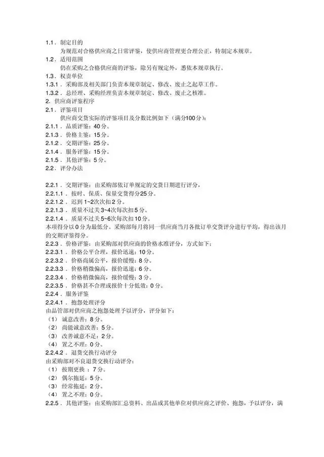 质量绩效(35分):来料合格率(20分)+质量改善响应(15分) 交付绩效(30分):准时交付率(15分)+弹性响应能力(15分) 成本绩效(20分):价格竞争力(10分)+降本配合度(10分) 服务绩效(15分):沟通效率(8分)+问题解决态度(7分)