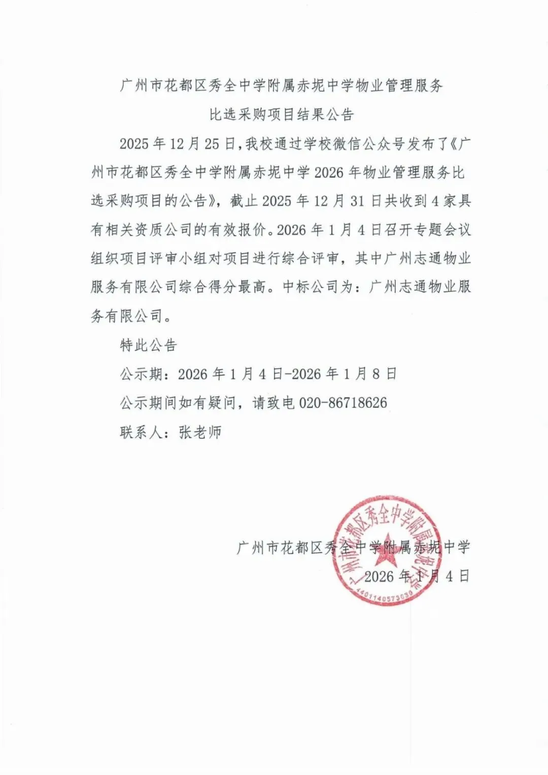 广州市花都区秀全中学附属赤坭中学物业管理服务比选采购项目结果公告