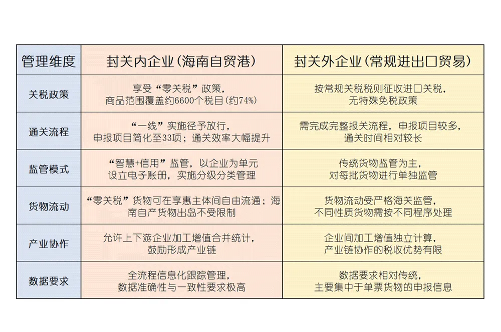 下表清晰展示了封关内企业与封关外企业在业务管理上的核心差异。