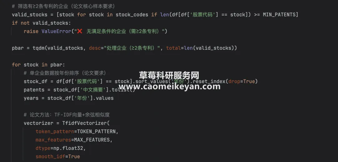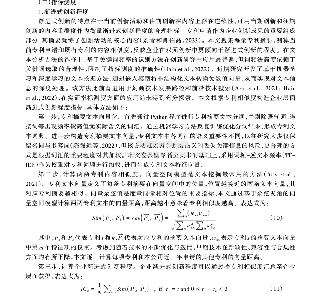 2、测算方式:参考顶刊《经济研究》孙雅慧(2024)老师的做法,渐进式创新的特点在于当前创新活动和往期创新在内容上存在连续性, 可用当期创新和往期创新的内容重叠度作为衡量渐进式创新程度的合理指标。专利申请作为企业创新成果的重要组成部分, 其摘要凝练了创新活动的核心内容 (刘青和肖柏高, 2023)。本文搜集海量专利摘要, 测算当前专利申请和既有专利的内容相似度, 反映企业在双元创新中更倾向于渐进式创新的程度。在文本分析方法的选择上, 基于关键词频率的识别方法在创新研究中应用最普遍, 但词频法高度依赖于关键词选取的合理性, 限制了指标测度的准确性 (Hain et al., 2022)。近期研究开发了基于机器学习和深度学习的文本挖掘方法, 通过嵌入模型将非结构化文本转换为数值向量, 从而实现对文本信息的深度处理。该方法此前普遍用于刻画技术发展路径和前沿技术搜索 (Arts et al., 2021; Hainet al., 2022), 在实证指标测度方面的应用尚未得到充分探索。本文根据专利相似度构造企业层面渐进式创新程度指标, 具体方法如下:第一步, 专利摘要文本向量化。首先通过 Python 程序进行专利摘要文本分词, 并剔除语气词、 连接词等出现频率较高但无实际含义的词汇。通过机器学习方法反复训练优化分词结果, 形成专利文本词典。进一步构造专利摘要文本向量, 专利文本中各词汇的语义重要性不同, 以往研究大多仅保留名词与形容词 (陈强远等, 2022 ), 但该方法难以避免割裂语义和丢失关键信息的风险, 更合理的方式是根据词汇的重要程度对其加权。本文在保留专利全文本的基础上, 采用词频-逆文本频率 (TF-IDF ) 作为权重对专利词频进行加权, 进而生成专利文本特征向量。具体做法和公式如下图文献所示,与文献做法一致!