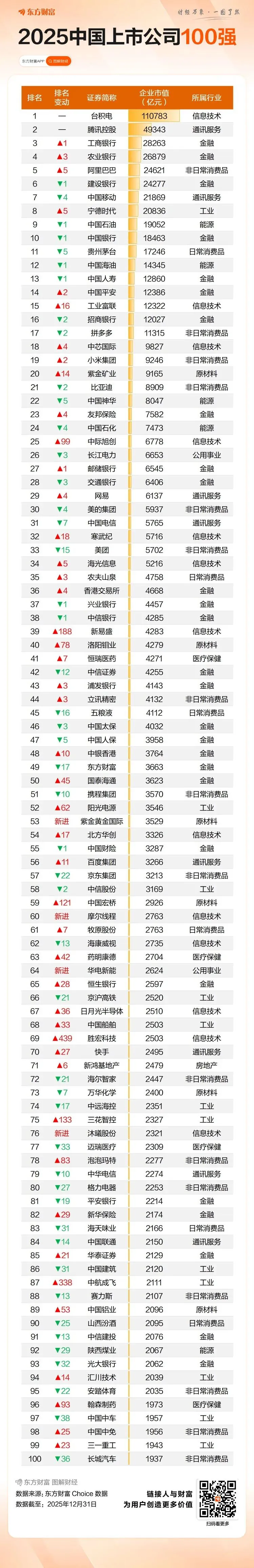 2025年股市收官,中国上市公司市值100强榜单揭晓。