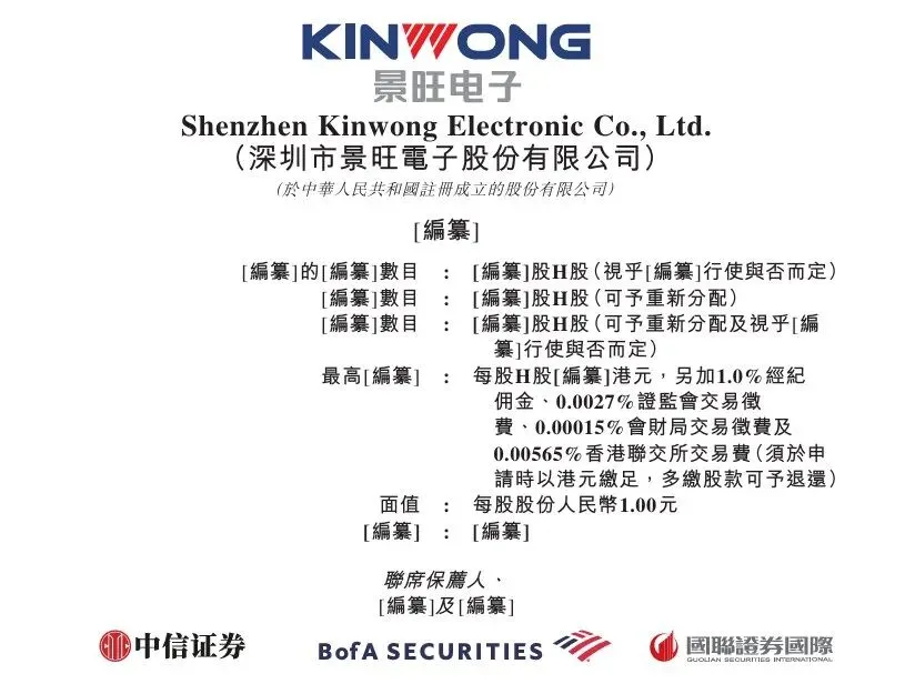 1月1日,港交所官网披露了深圳市景旺电子(603228)股份有限公司(以下简称“景旺电子”)在港交所提交的上市申请,公司上市材料被正式受理,联席保荐人为中信证券、Bofa SECURITIES和国联证券国际。