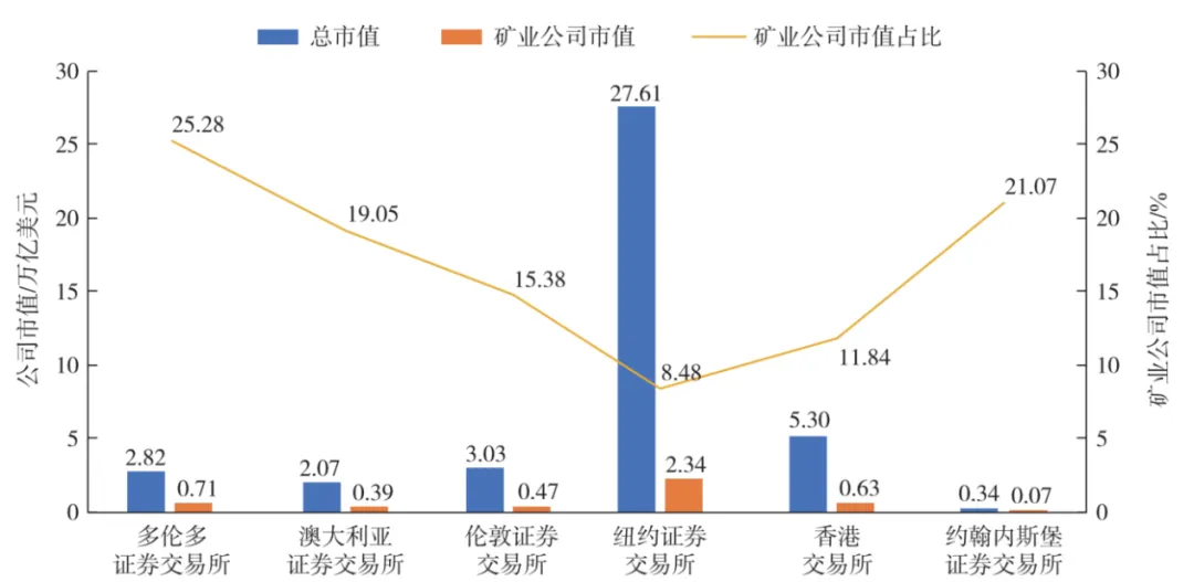 从上市矿业公司市值在所有上市公司市值的占比来看,多伦多证券交易所以25.28%的比例位居第一,约翰内斯堡证券交易所以21.07%的比例位居第二,而纽约证券交易所矿业板块的市值占比最低,尽管如此,其上市矿业公司市值的绝对值依然高居首位。