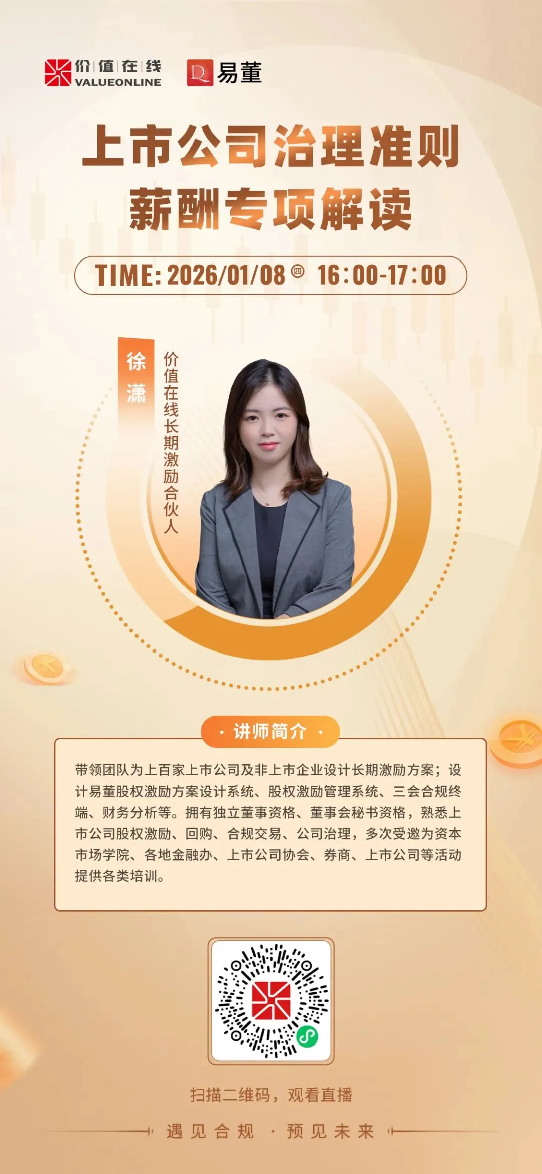 在此背景下,为助力上市公司董办人员等核心从业者精准理解新规内涵,精准把握上市公司治理准则中关于薪酬管理的核心要求,深度解析关键条款落地要点,切实提升企业薪酬激励体系的科学性与合规性,推动上市公司可持续高质量发展。本期易董特别邀请到价值在线长期激励合伙人徐潇女士于2026年1月8日(下周四)下午16:00,为大家带来“上市公司治理准则薪酬专项解读”易董云分享会。届时欢迎大家点击收看!