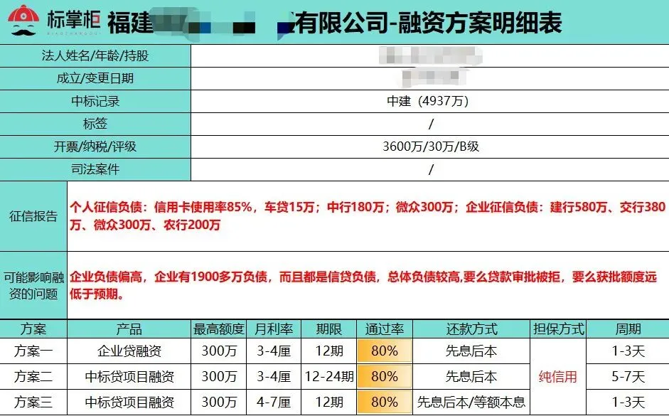 客户个人及企业负债率均偏高,如果继续走传统融资路径,无论从征信、负债还是行业限制,基本都会被卡死。因此,本次融资思路从一开始就明确:不围绕客户本身做信用,而是围绕“近期中标项目”做融资。