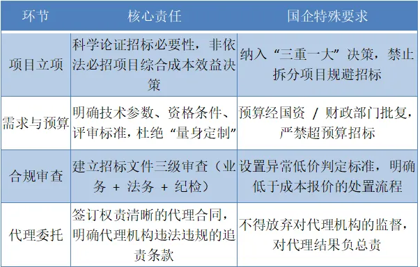 3.责任主体:国企法定代表人、分管领导、招标部门负责人、经办人分级担责,履职情况纳入经营责任与国资监管报告,实行 “插手干预登记报告制度”。