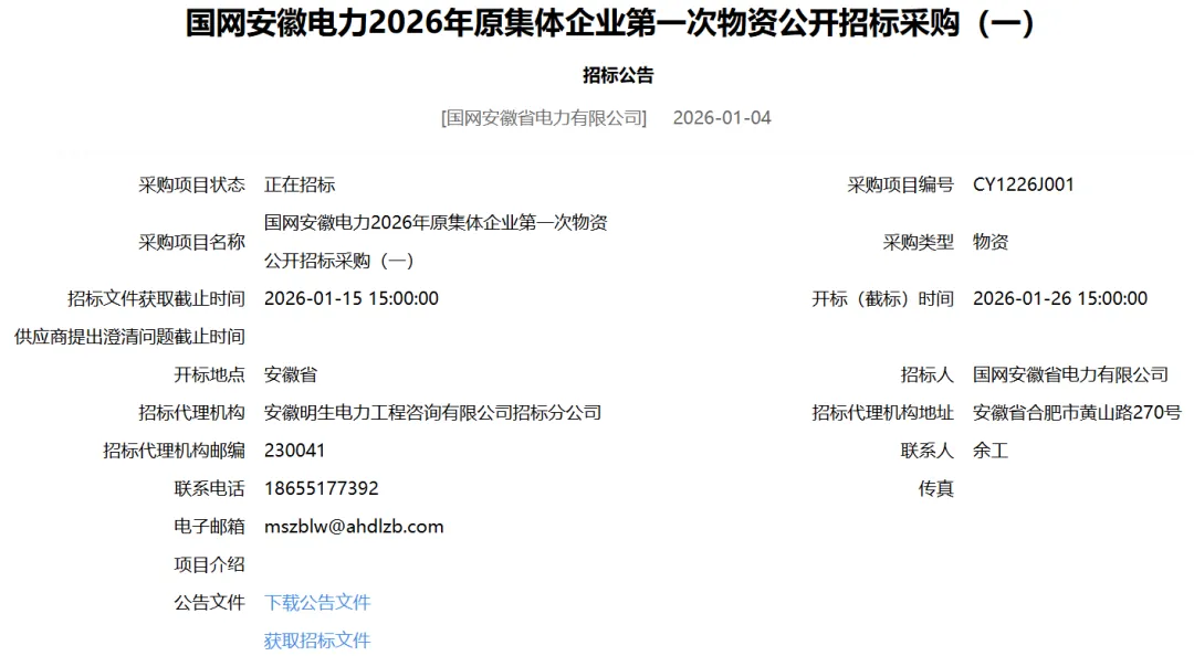 国网安徽电力2026年原集体企业第一次物资公开招标采购(一)招标公告