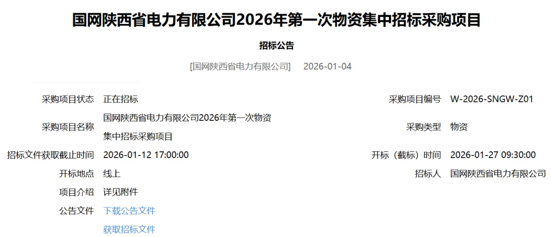 国网陕西省电力有限公司2026年第一次物资集中招标采购项目招标公告