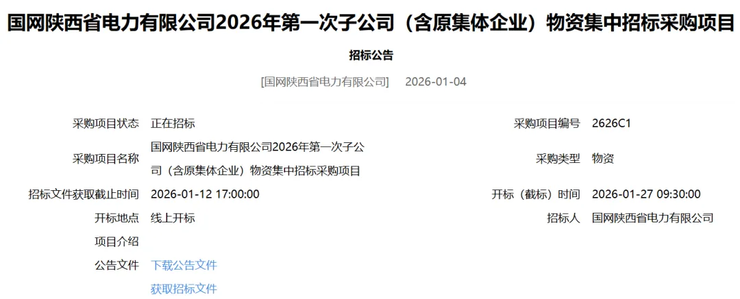 国网陕西省电力有限公司2026年第一次子公司(含原集体企业)物资集中招标采购项目招标公告