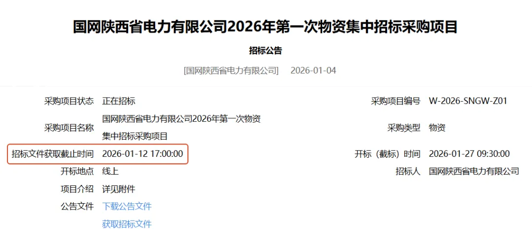 国网陕西省电力有限公司2026年第一次物资集中招标采购项目招标公告(招标编号:W-2026-SNGW-Z01)