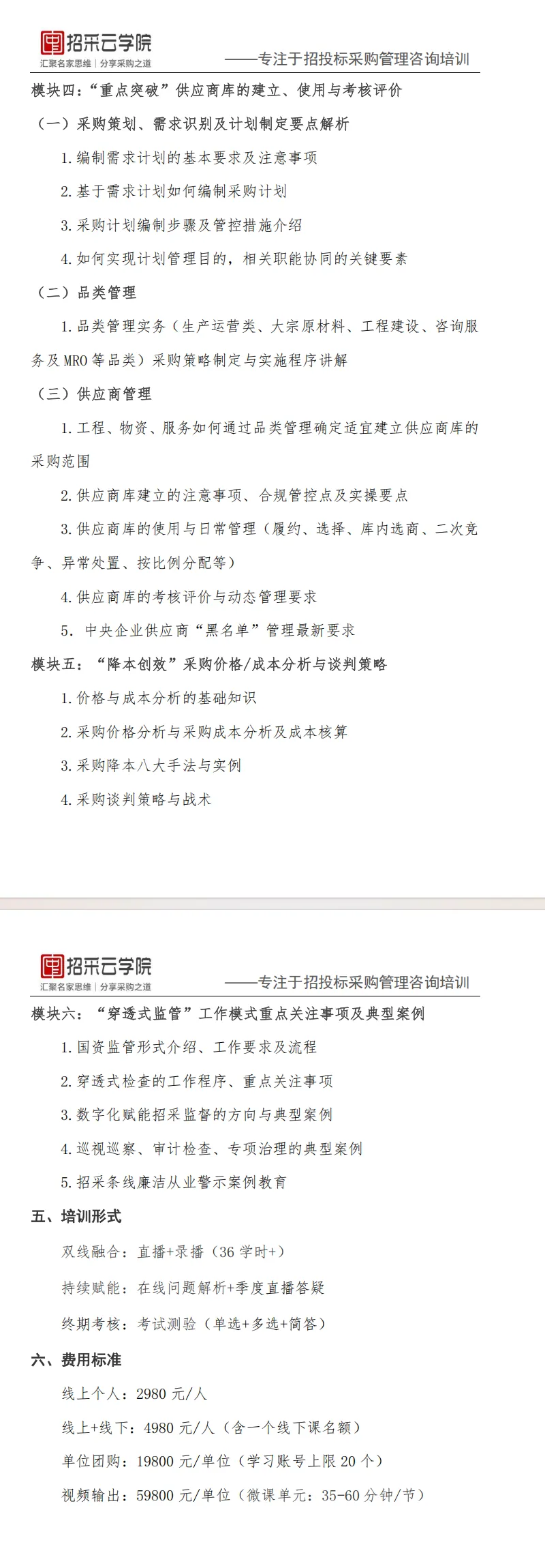 线上:聚焦国有企业招标采购条线能力提升专题培训课程一国企招标采购 360°系列课程(3.0 版全新升级)
